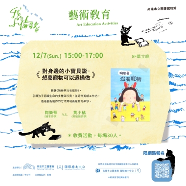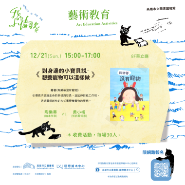 - 活動內容:繪本作家先說故事《陶樂蒂沒有寵物》,並延伸寵物照護觀念,再邀請剪紙藝術家帶著小朋友創作動物剪紙,透過藝術創作的方式實現養寵物的夢想。